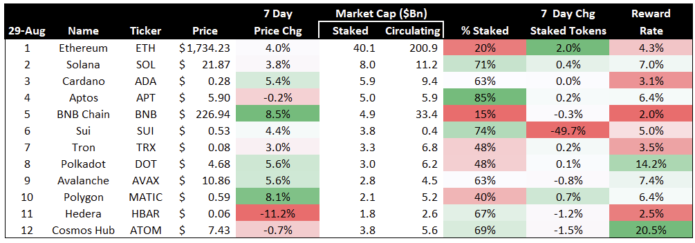 Ethereum (ETH) had the best relative staking inflows over the last week with a 2% increase in the amount of staked tokens, increasing the total supply staked to 20%. Solana (SOL) and Polygon (MATIC) followed with increases of 0.7% and 0.4% respectively. SUI was the big outlier on the staking outflows front with a 49.7% decrease in staked tokens this week.